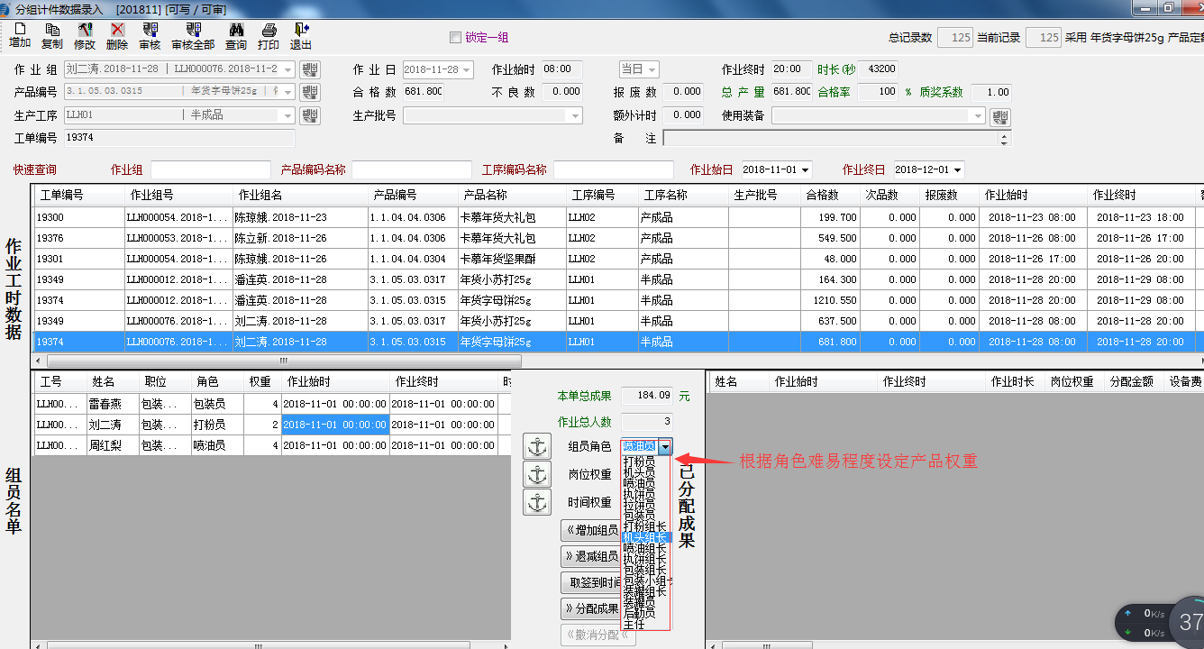 對于計件工資產品工序多且工序難易程度不一等綜合因素考慮,為了保證能夠正??焖俳y計分析員工個人參入計件所得,特別啟用角色加權重的模式,確保每個產品可以根據生產難易程度合理設置不同角色權重,如下圖: