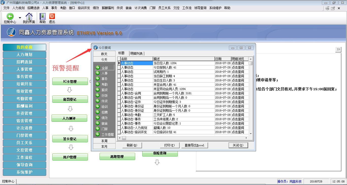 如上所示,用戶一登錄系統(tǒng),即彈出預(yù)警提醒與人文關(guān)懷結(jié)合的信息,如當(dāng)天總?cè)藬?shù),當(dāng)天報(bào)到人數(shù),當(dāng)天辭工到期人員,當(dāng)天生日人數(shù),當(dāng)天入職紀(jì)念日人數(shù)以及未簽勞動(dòng)合同人數(shù)、未投保人數(shù),合同證件到期人數(shù)等,預(yù)警提醒信息可以依據(jù)客戶需求自定義,雙擊即可查找或?qū)С雒骷?xì),一目了然。