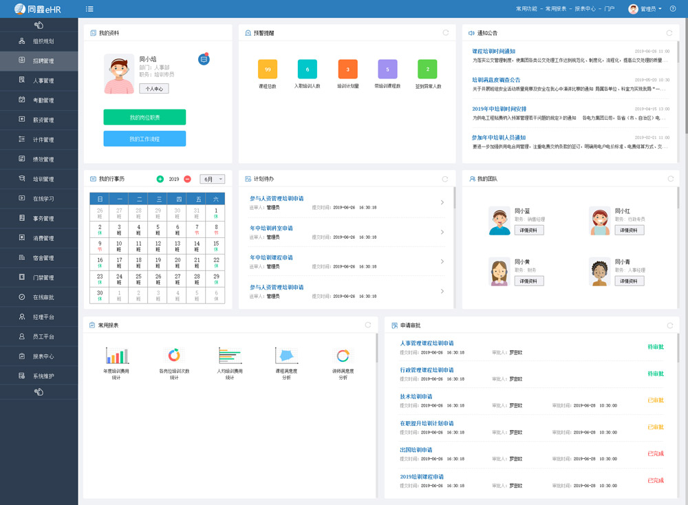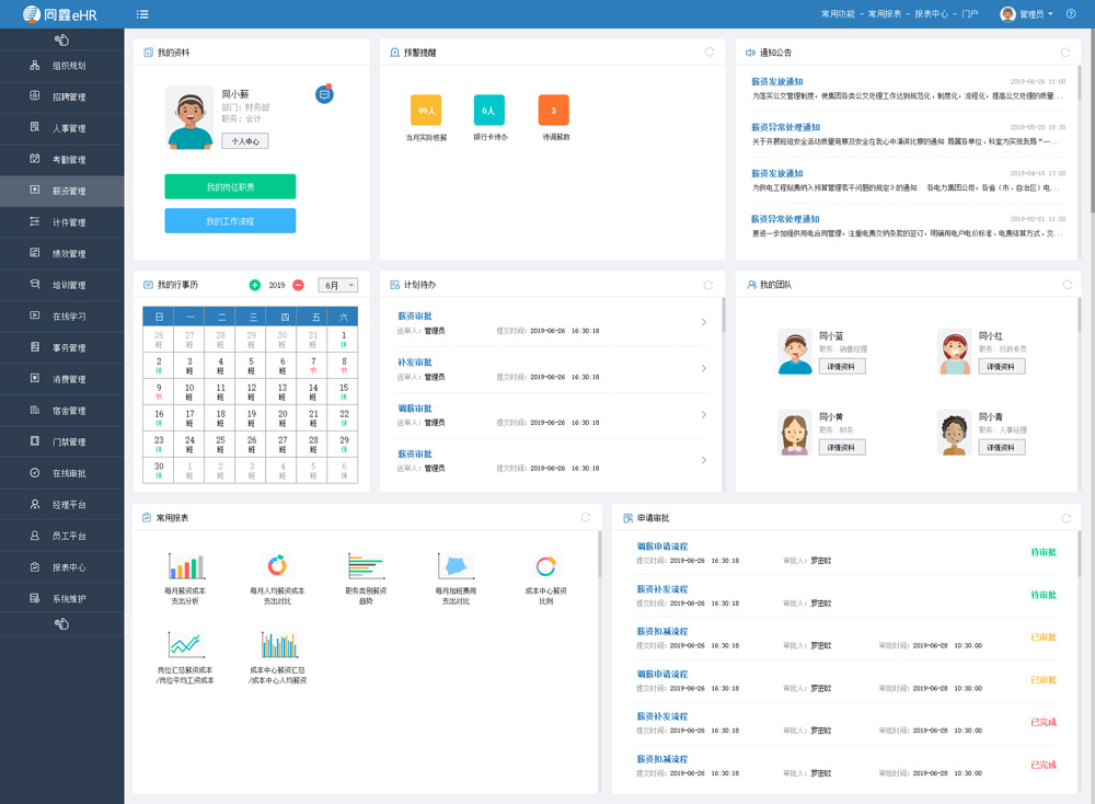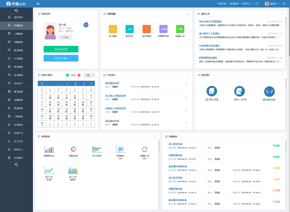 ● HR看板:多維度圖形化展示HR統計分析信息;